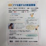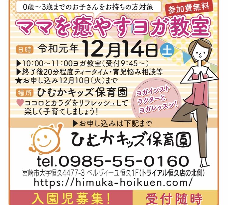 主任のつぶやき今月のヨガ教室のお知らせ2019年12月5日事務局第4回ヨガ教室は12月14日(土)開催です。参加無料ですのでぜひご参加ください!電話予約はひむかキッズ保育園まで。0985-55-0160