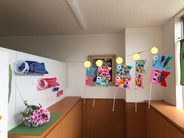保育園の玄関には子ども達が製作したかわいいこいのぼりが元気いっぱい泳いでいます。保育園でも手洗い・うがい、消毒等を徹底していますので、ご家庭でのご協力をお願い致します。