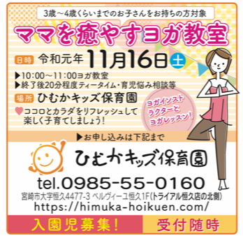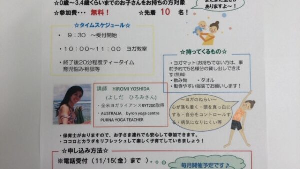 11月16(土)開催の「ママを癒すヨガ教室」まだまだ空きがあります!