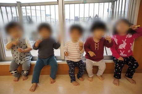 給食を食べた後はみんなで歯みがき。上手に磨けるようになったよ!